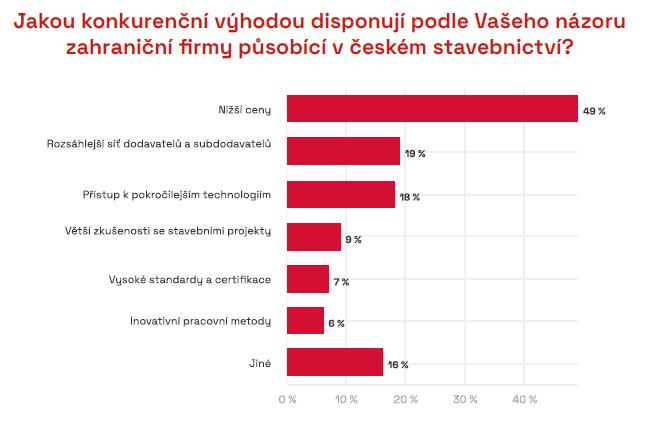 V posledních 5 letech zaznamenalo 34 % ředitelů stavebních firem růst zahraniční konkurence na českém trhu. Zahraniční společnosti jsou vnímány jako silnější díky nižším cenám, což 49 % ředitelů stavebních firem považuje za hlavní výhodu. Stavební společnosti ale upozorňují, že toto cenové zvýhodnění bývá často na úkor kvality. Naopak 66 % ředitelů nevnímá výrazný růst zahraniční konkurence. Vyplývá to z průzkumu CEEC Research