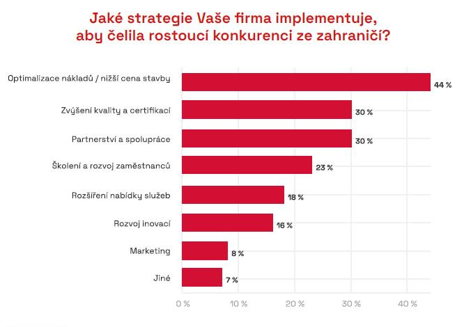Mezi další konkurenční výhody cizích firem se řadí rozsáhlejší sít dodavatelů a subdodavatelů (19 %) umožňující zahraničním firmám být efektivnější a flexibilnější. Přístup k pokročilejším technologiím vnímá jako konkurenční výhodu 18 % ředitelů stavebních firem. Pro 44 % českých stavebních firem je proto zásadní optimalizace nákladů a snižování cen staveb. Zvýšení kvality a získávání certifikací je důležité pro 30 % ředitelů, stejně tak 30 % dotázaných spoléhá na partnerství a spolupráci s dalšími firmami, školení a rozvoj zaměstnanců pro 23 %.