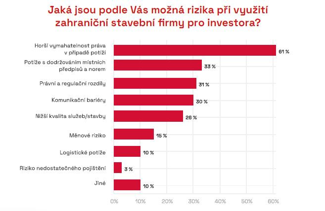 Největším rizikem při využití zahraniční stavební firmy je horší vymahatelnost práva v případě potíží, což v průzkumu uvedlo 61 % stavebních firem. Dalším rizikem jsou právní a regulační rozdíly, které zmínilo 31 % ředitelů. Rozdíly v právních a regulačních předpisech vedou k nejasnostem a problémům s dodržováním místních zákonů. Komunikační bariéry vidí jako problém 30 % ředitelů, což ztěžuje efektivní spolupráci a koordinaci mezi investorem a zahraniční firmou.